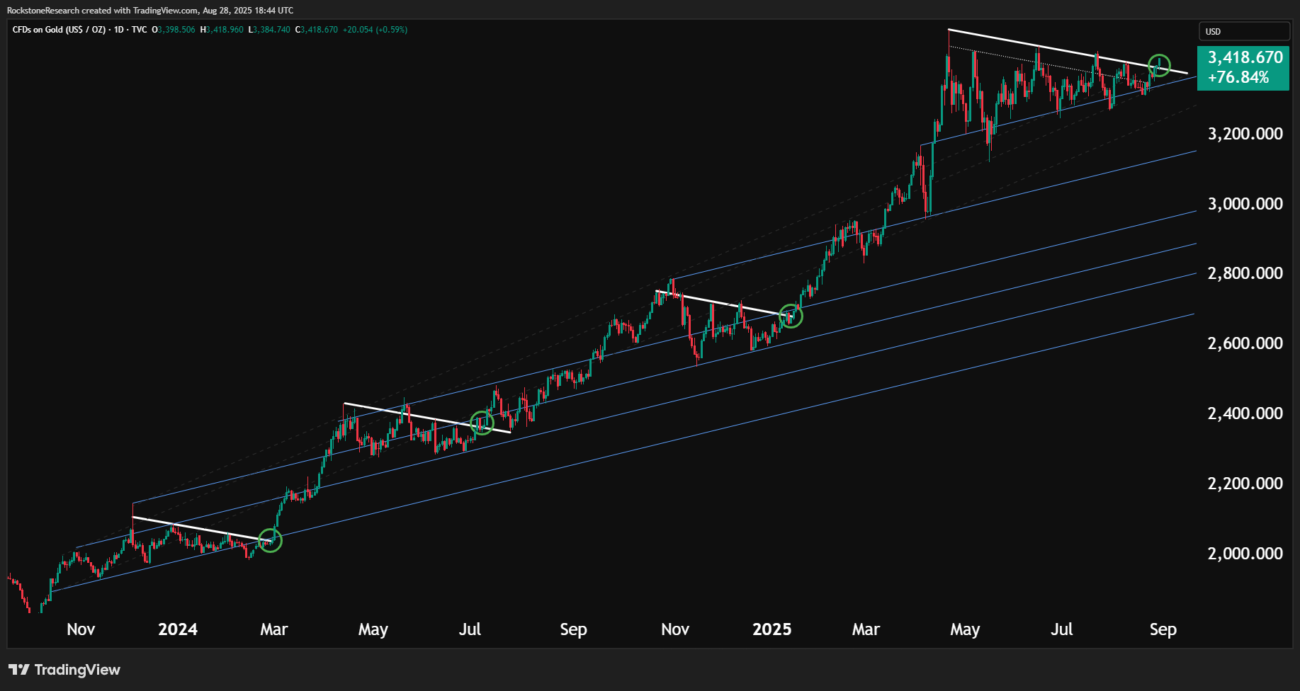 Full size / Gold since September 2023: The chart shows a clear sequence of consolidation phases (white triangles) followed by decisive breakouts (green circles). Each breakout has driven prices to new levels within the long-term ascending channel. The most recent breakout above $3,400 suggests continuation of the trend, with momentum firmly intact.