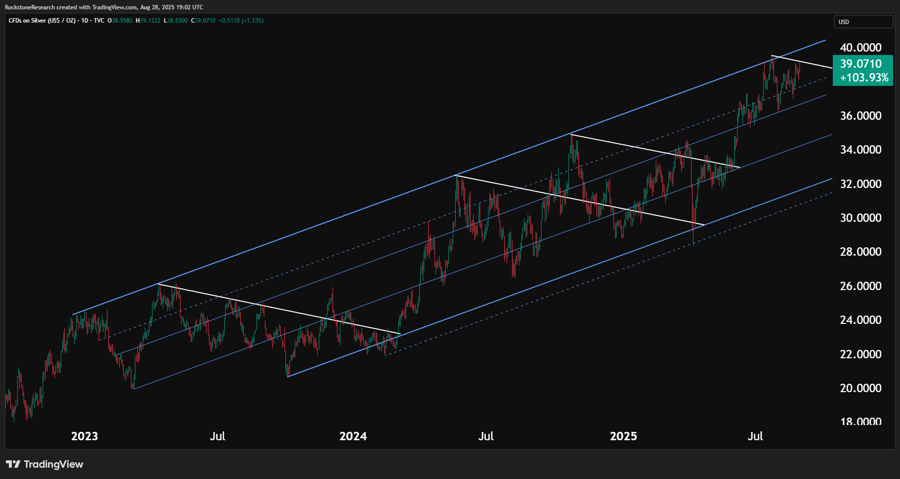 Full size / Silver since September 2022: The price action mirrors gold’s earlier move, with repeated consolidations resolving upward. Currently trading at $39/oz, silver is looking to break above the $40 level now. Despite strong gains in the last few years, silver remains well below its 2011 peak near $50/oz, while gold has already surpassed its 2011 high by a wide margin.